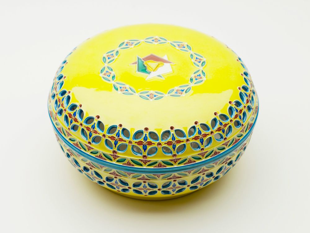 而妙斎好 黄交趾 七宝透シ食籠Confectionery container of openwork, colored Kochi style