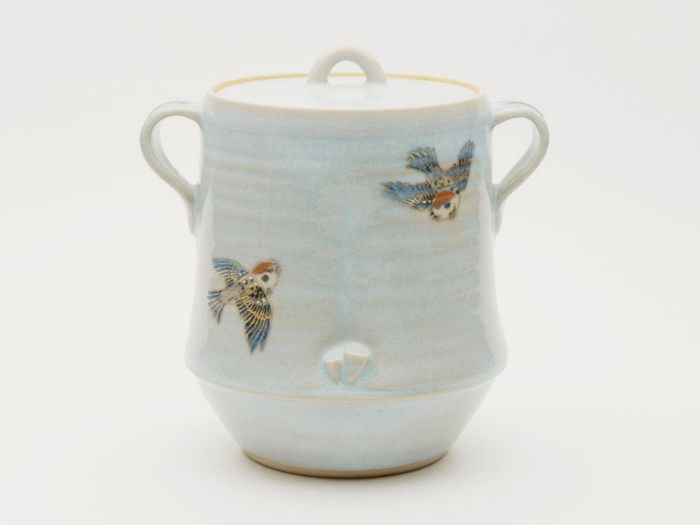 而妙斎好 ワラ灰釉 竹ニ雀ノ絵水指Mizusashi of bamboo shape, colored sparrows on straw ash glaze