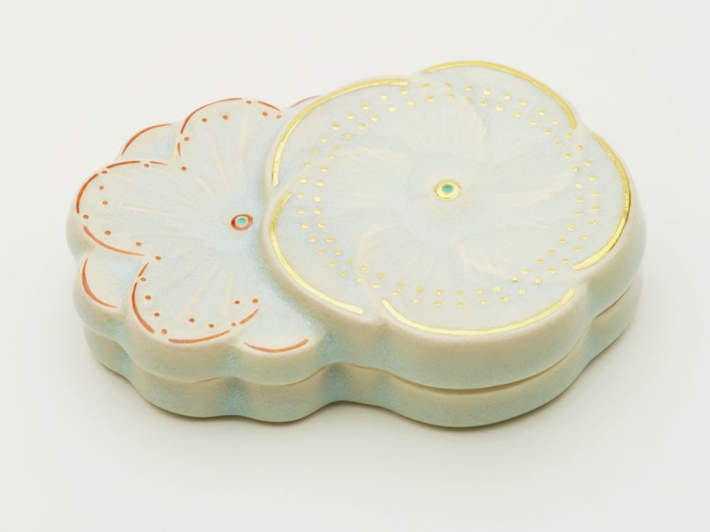 久田尋牛斎 堀内兼中斎好 梅重ネ松ノ画香合Incense container of Ume(Japanse plum)blossoms sharp, on straw ash glaze