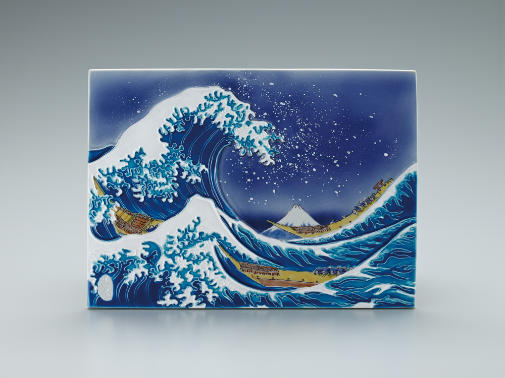 染付交趾葛飾北斎富嶽三十六景ノ内「神奈川沖浪裏」陶額Ceramic panel, colored Kochi style 'Kanagawa oki namiura’ (drawing Mt.Fuji with boat tossed about by large wave) by Katsushika Hokusai